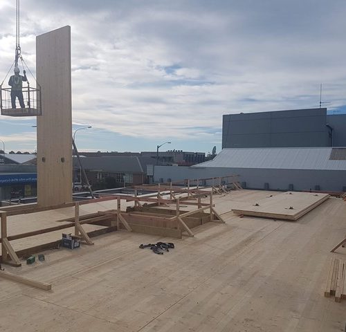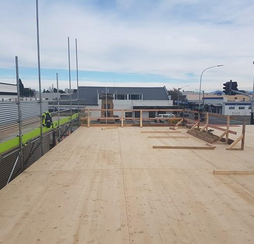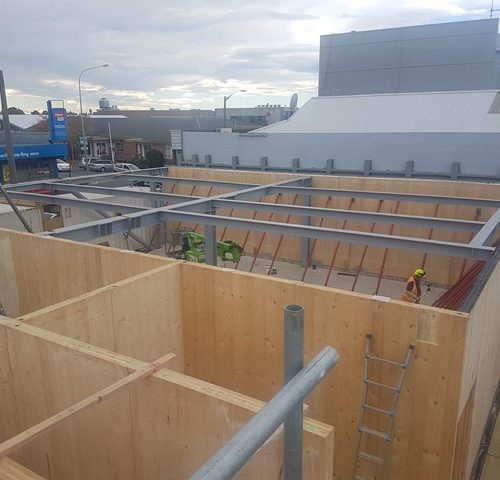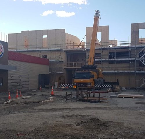 Due to the above boundary conditions and also Burger King Rangiora’s desire to achieve the removal of the scaffolding for the South Elevation of High Street Building by the time it opened for business, it was decided to utilize CLT wall, lintel and floor panels (all 150 thick with 5 layers 40-30-20-30-40) in as many places as possible in the build…