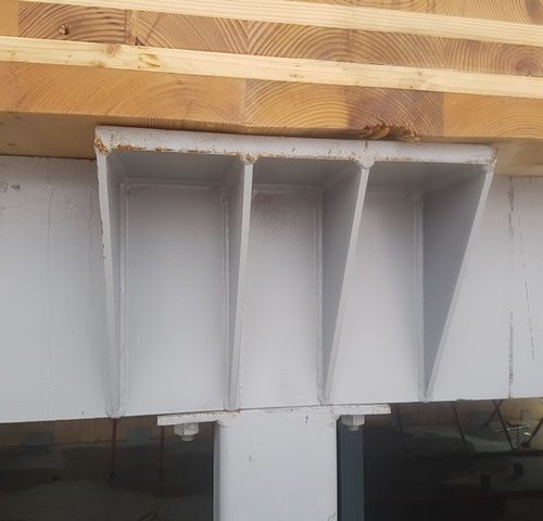 There was one other place where a steel chord plate (connecting the CLT floor panels ensuring their diaphragm action) was in a conflicting location on top of the floor panels and so we placed it underneath the floor panels but needed to weld it to either side of the top flange of one of our hot-rolled steel secondary beams…